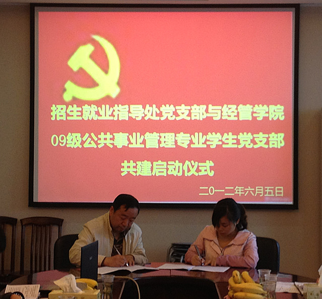 为贯彻落实《中共贵州师范大学委员会关于在创先争优活动中开展基层组织建设年活动的实施方案》的文件要求,充分发挥“三联三建三带”工作机制,实现合作共建、相互促进、良性发展的目标,6月5日上午,我校招生就业指导处党支部与经济与管理学院2009级公共事业管理专业学生党支部共建启动仪式在经济与管理学院会议室举行。学校“党的基层组织建设年活动”督察组督导员陈昌华老师,经济与管理学院党委书记巴建伟、党委副书记项君、副处级组织员赵本喜,招生就业指导处副处长程虹及两个党支部全体教师党员和学生党员参加了仪式。仪式由项君主持。