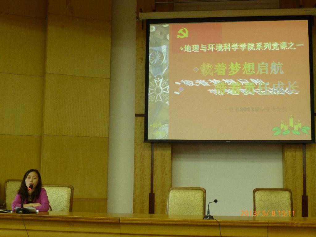 在2013年毕业季来临之际,为增强毕业生党员党性修养、进一步提高党员意识,在“文明离校”等工作中发挥表率作用,地环学院党委于5月8日下午在田家炳三楼多功能厅召开2013届毕业生党员党性教育培训会。邀请学院副处级组织员郭锐老师主讲。地环学院、南方喀斯特研究院2013届本科、研究生党员参加会议。