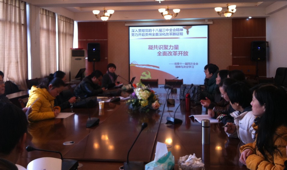 杨建红首先介绍了省委十一届四次全会概况,传达了省委书记赵克志在十一届四次全会上的讲话精神和会议审议通过的《中共贵州省委关于贯彻落实‹中共中央关于全面深化改革若干重大问题的决定›的实施意见》的主要精神。她指出,省委十一届四次全会对我省在新的历史起点上全面深化改革作出了重要战略部署,发出了我省全面深化改革的动员令,吹响了贵州全面推进发展的冲锋号,对加快贵州科学发展、后发赶超、同步小康具有重要而深远的意义,全院党员教师要深入学习贯彻全会精神,自觉把思想和行动统一到省委决策部署上来。
