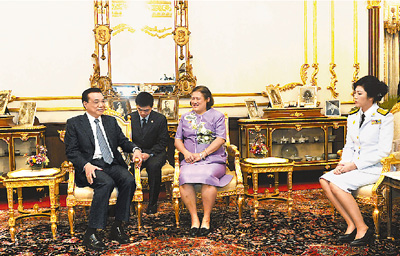 本报曼谷10月12日电 (记者吴乐珺、施晓慧)国务院总理李克强12日上午在泰国王宫会见泰国国王普密蓬的代表诗琳通公主,泰国总理英拉陪同会见。